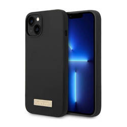 Original Handyhülle IPHONE 13 Guess Hard Case Silicone Logo Plate MagSafe (GUHMP13MSPLK) schwarz